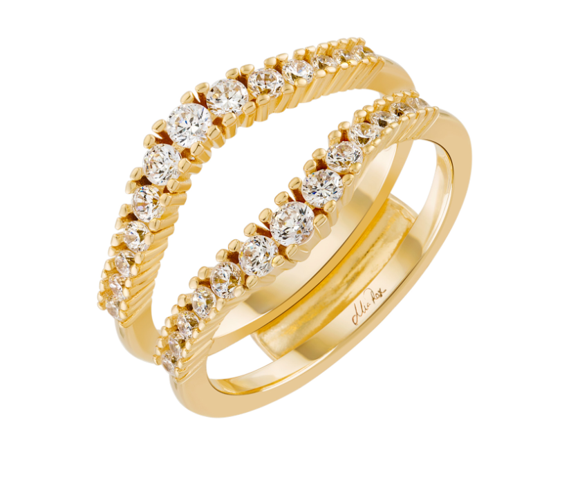 Anel em prata de lei 925, com banho de ouro de 14k, com duas linhas de zircónias cravadas. Este anel funciona sozinho ou como base para usar com outros anies da coleção.No interior, esta joia possui a gravação da assinatura da Mia Rose. Combina este anel com outros anéis desta coleção e cria looks personalizados e diferenciadores.